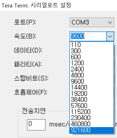 위의 코드는 9600bps 설정하고 있습니다. 이것은 1초에 9600개의 비트를 전송한다는 의미입니다.