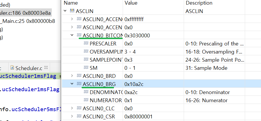 IfxAsclin_Asc_initModule 함수를 통하여 UART의 레지스터값을 입력하여 넣고 있는 것을 볼수 있습니다.