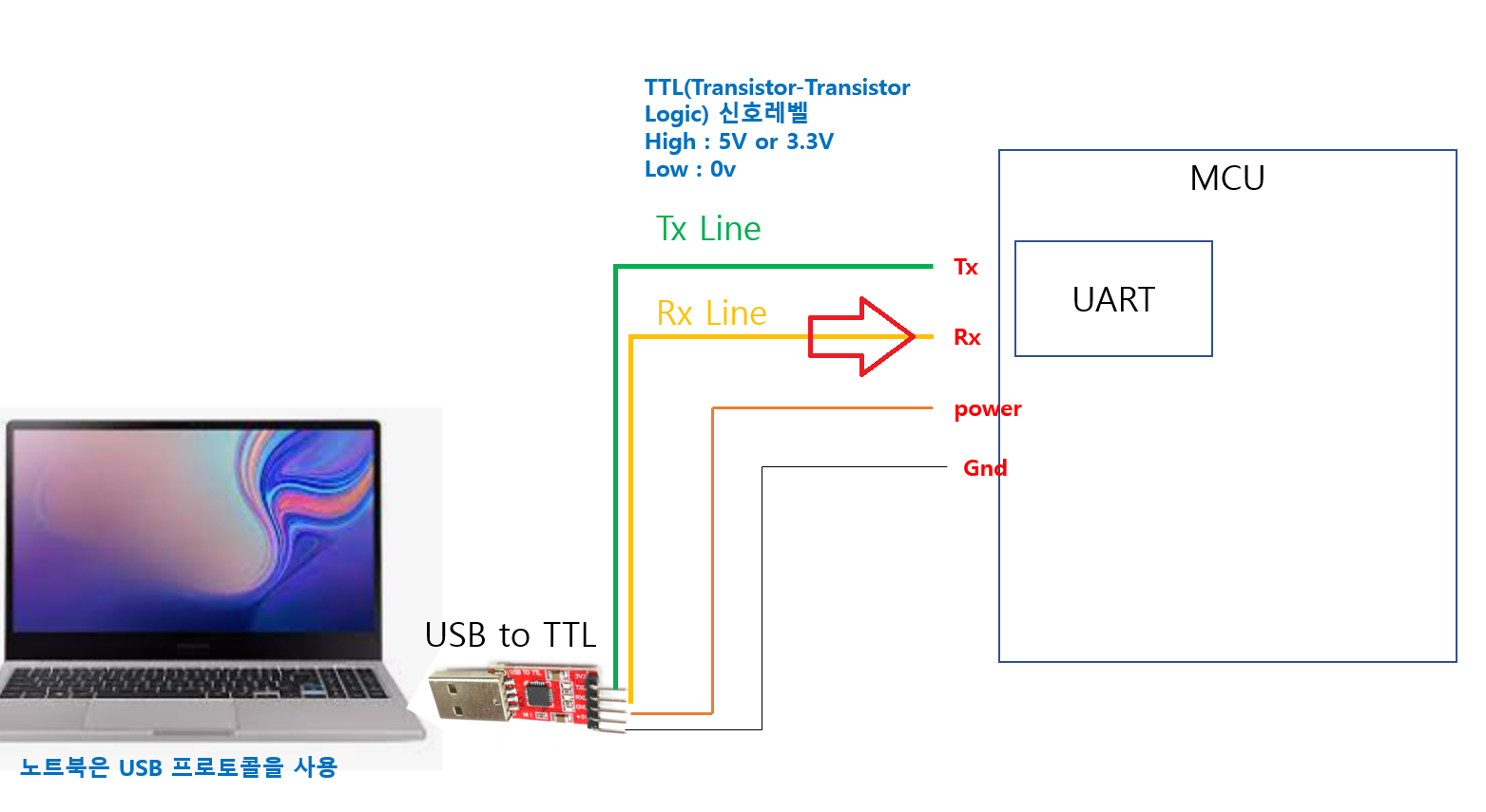 MCU안의 UART 모듈 Rx 라인으로 들어가게 됩니다.