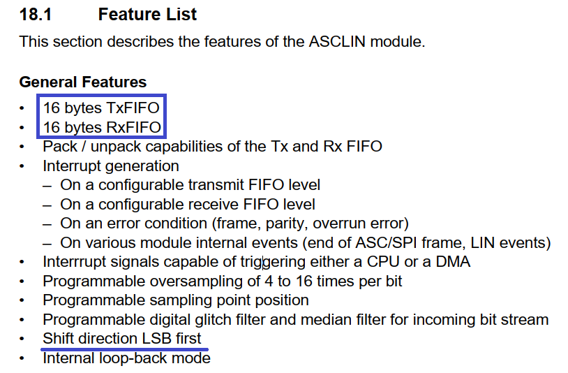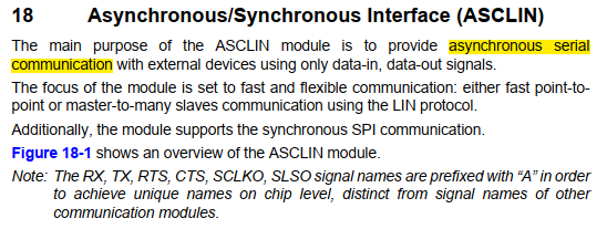위에서 ASCLIN 모듈은 asynchronous serial communication을 지원한다는 내용을 확인 할 수 있습니다.