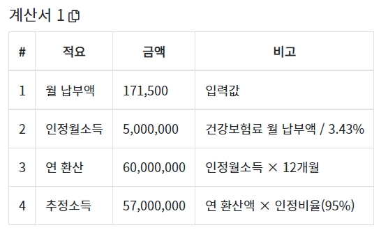 (추정 소득) x 0.0343 / 12 = 171,500원