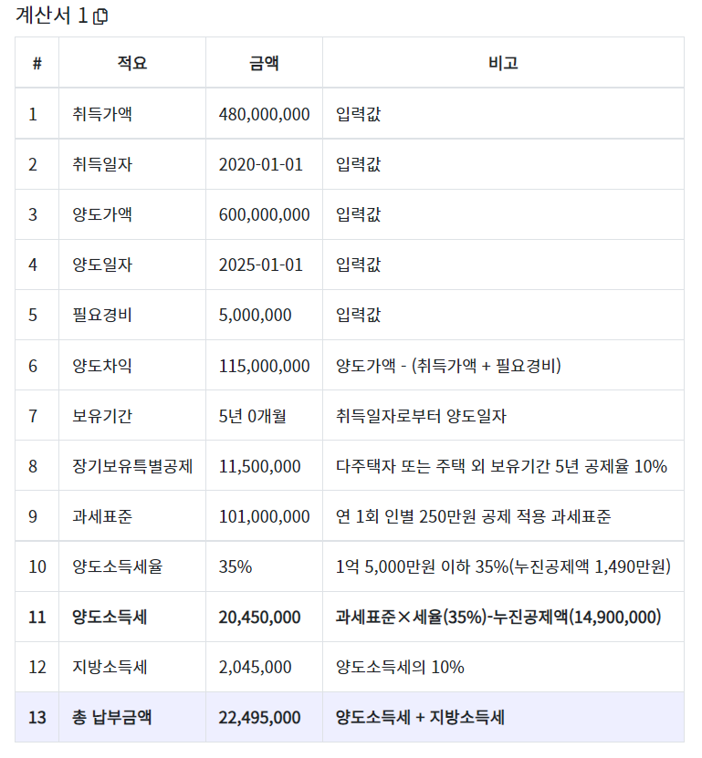 - 최종 납부 양도소득세 = 20,450,000원 + 2,045,000원 = 22,495,000원