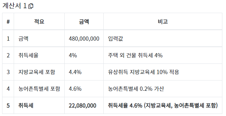 - 취득세 = 480,000,000 x (4% + 0.4% + 0.2%)