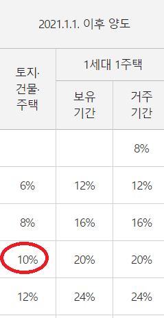 - 장기보유특별공제 : 보유기간 5년 공제율 10%