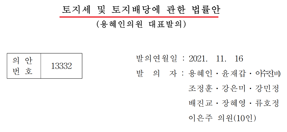 - 이에 대해 종합부동산세를 대처하는 토지세를 신설하고, 그 세액을 모든 국민에게 배분하는 법안 추진