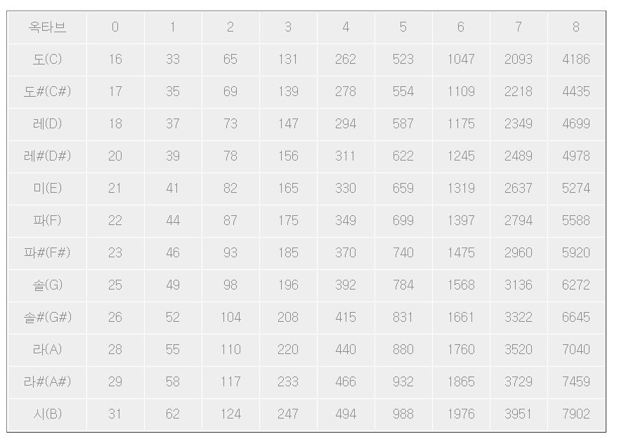 아래는 옥타브와 음정에 따른 주파수를 나타내고 있습니다.