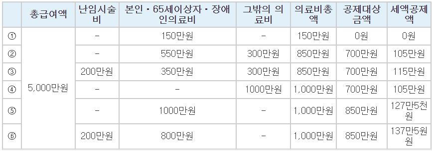 총 의료비가 150만원보다 작으면 공제혜택을 받지 못합니다.