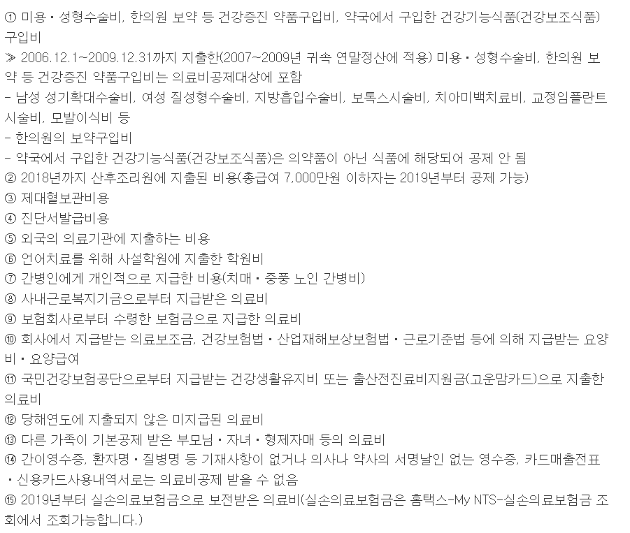 미용, 성형수술, 한의원 보약, 건강관련 약품 및 식품은 의료비 공제를 받을 수 없습니다.
