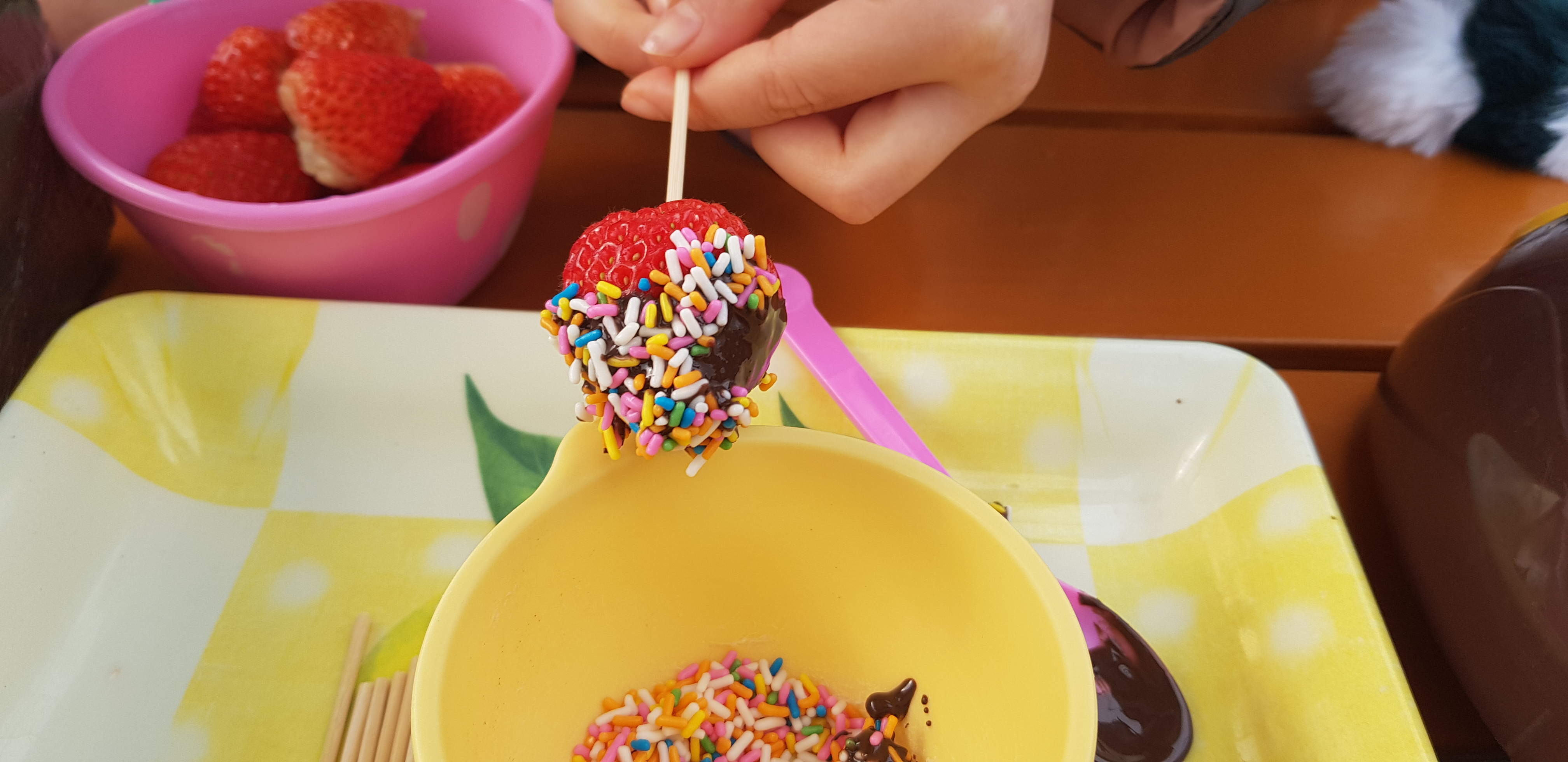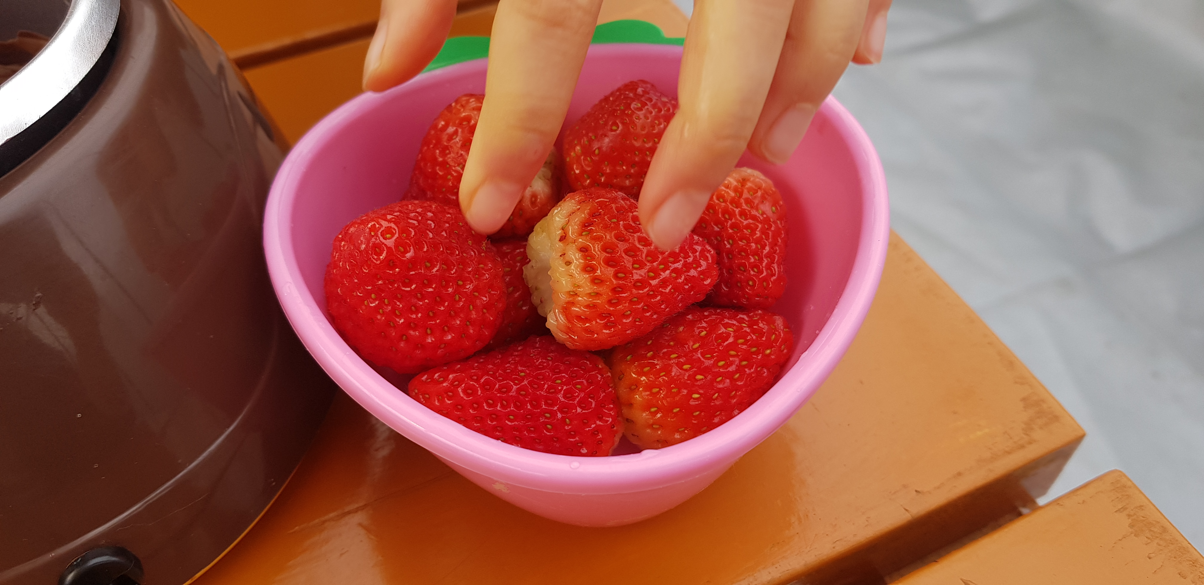 아래와 같이 딸기를 초코릿에 묻혀서 추가 토핑을 합니다 ^^