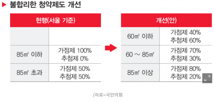 아래는 국민의 힘에서 제시하는 청약제도 개선 표 입니다.