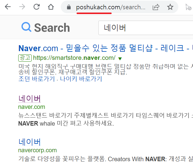 그런데, 갑자기 구글 검색창이 사라지고 아래와 같이 poshukach 사이트가 나오게 되었습니다.