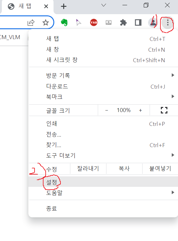 1) 구글 크롬에서 아래 그림과 같이 점 3개를 누르고 설정을 선택합니다.