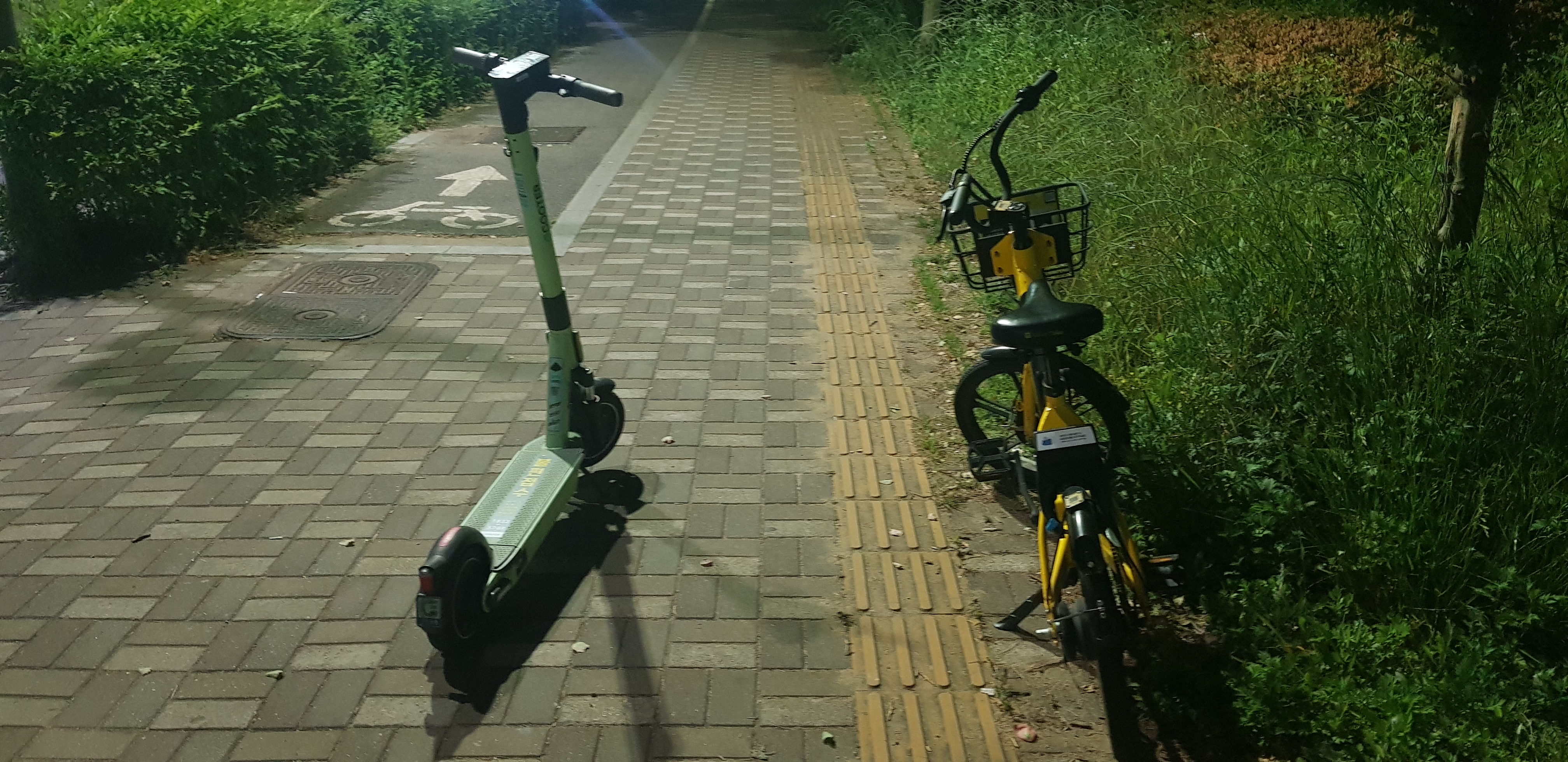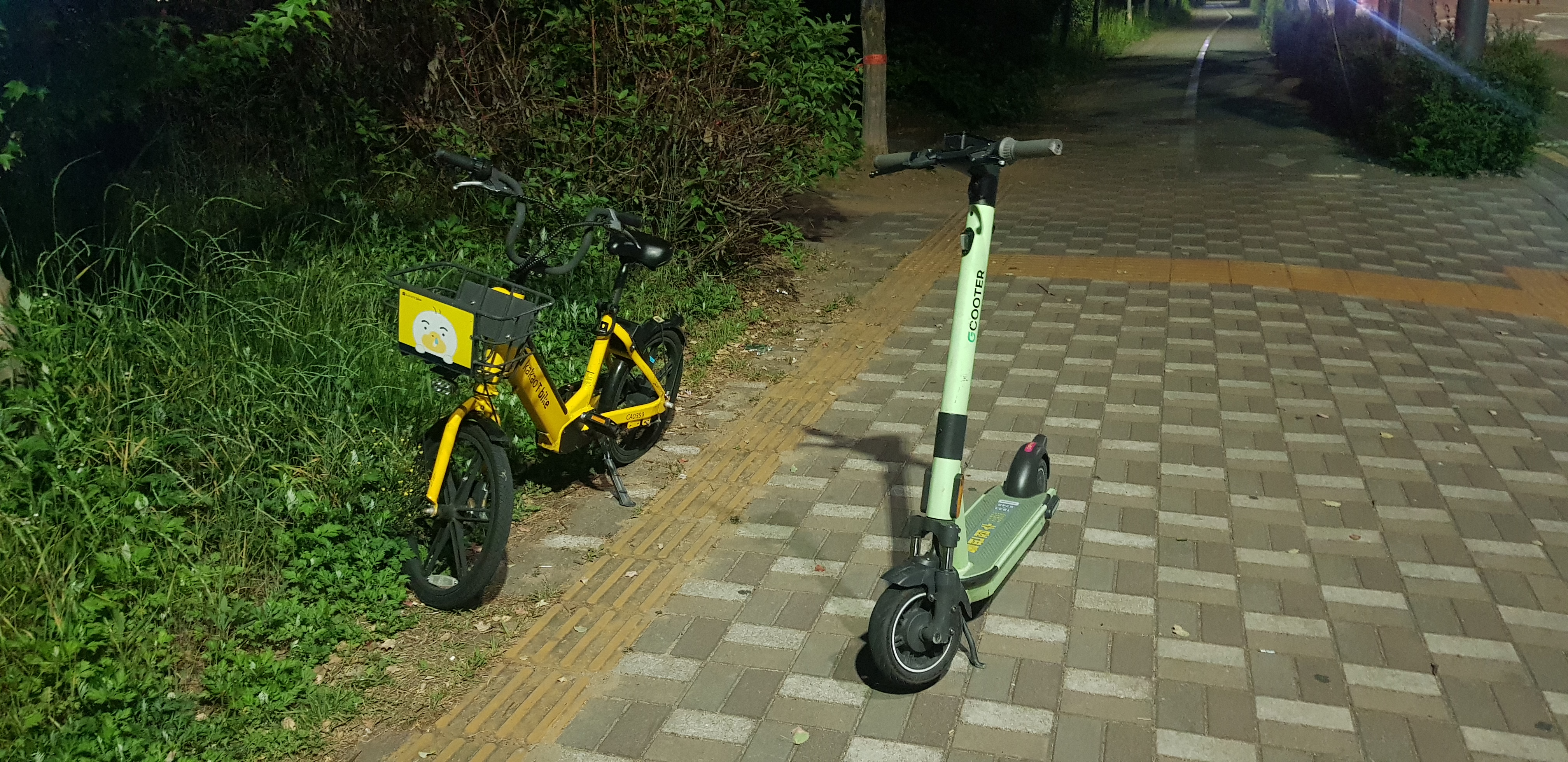 아래사진은 집주변에 세워진 카카오 자전거와 킥보드 입니다.