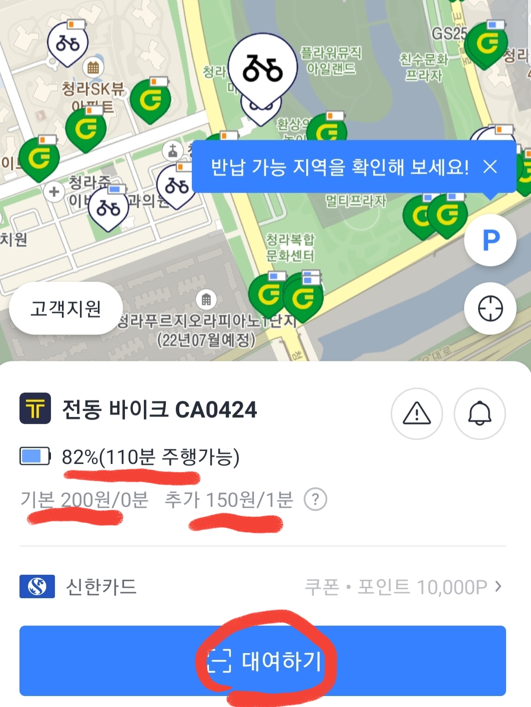 제기 선택한 자전거는 82%충전되어 있고 110분 이용 가능합니다.