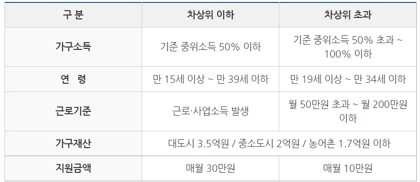 10만원에 해당하는 경우는 연소득 2,400만원 이하인 근로중인 청년입니다.