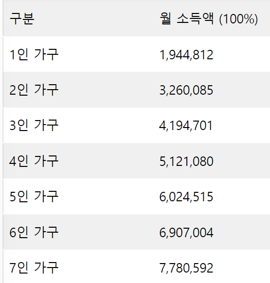 여기서 기준 중위소득 100%는 아래 도표를 참고해 주세요.
