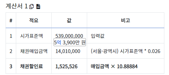 채권매입금액 = 539,000,000원 x 0.026 = 14,014,000원입니다.