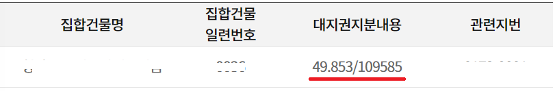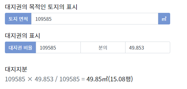 대지지분 = 109585 x (49.853 / 109585) = 49.853m2이 됩니다.