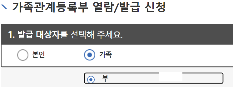 이렇게 가족을 증명하기 위해서는 발급대상자를 변경하여 발급을 하시면 됩니다.
