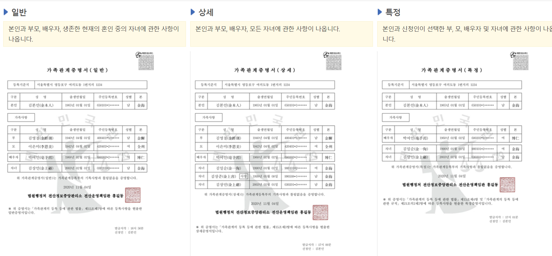 일반증명서, 상세증명서, 특정증명서의 차이는 아래를 참고해주세요.