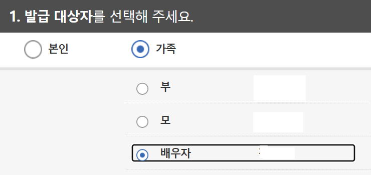 그리고 배우자를 선택하여 발급을 하면 됩니다.