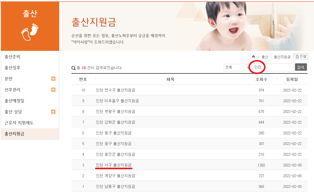 임신육아종합포털아이사랑 > 출산 > 출산지원금 (목록)