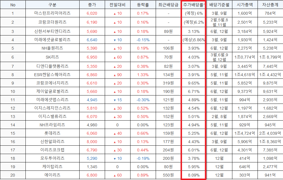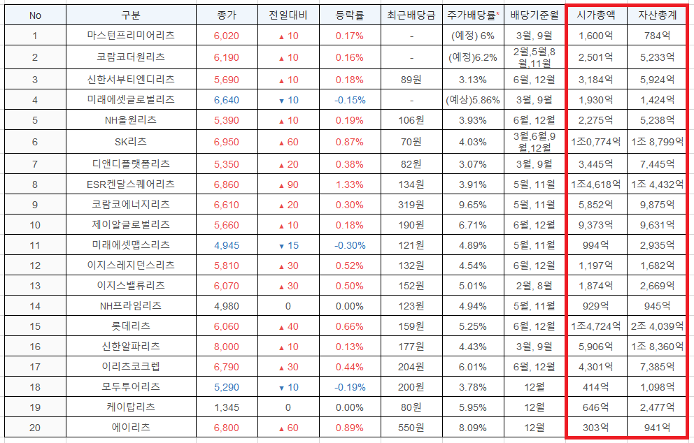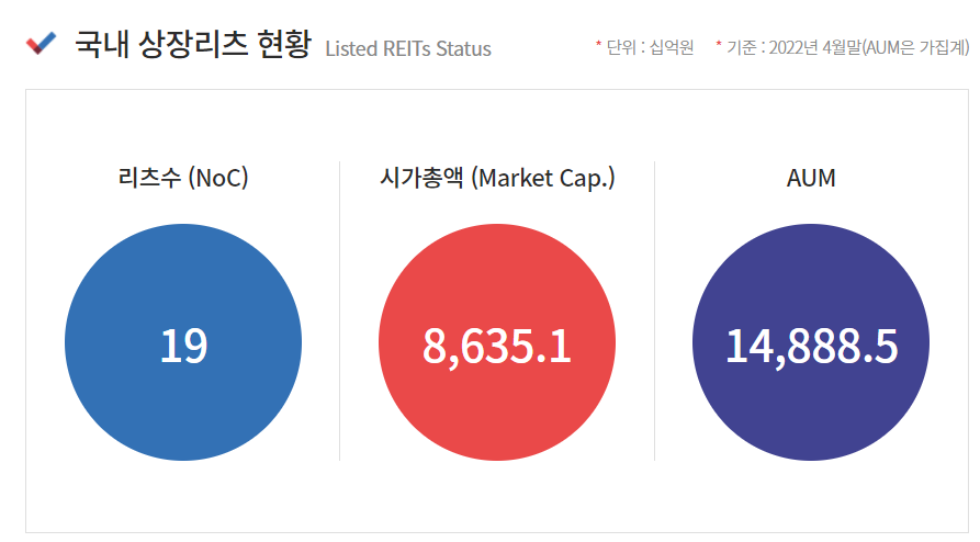 현재 국내에 상장리츠 현황은 아래와 같이 19개입니다.