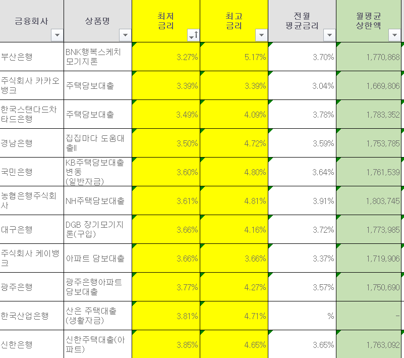변동금리 최저금리가 부산은행이 3.27%입니다.