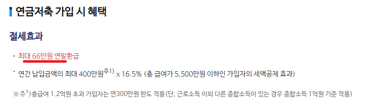 즉 연간 400만원을 납부하면 최대 66만원 연말환급이 되네요.