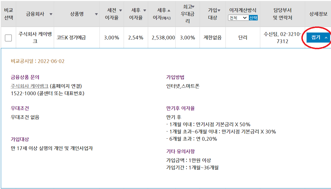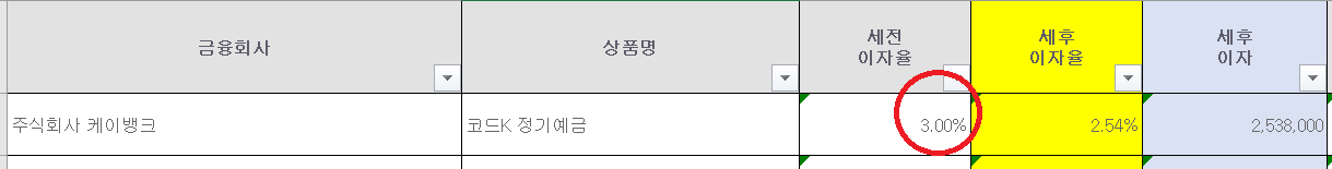 우선, 케이뱅크에서 세전이자율이 3%, 세후 이자율이 2.54%인것을 확인할수 있습니다.