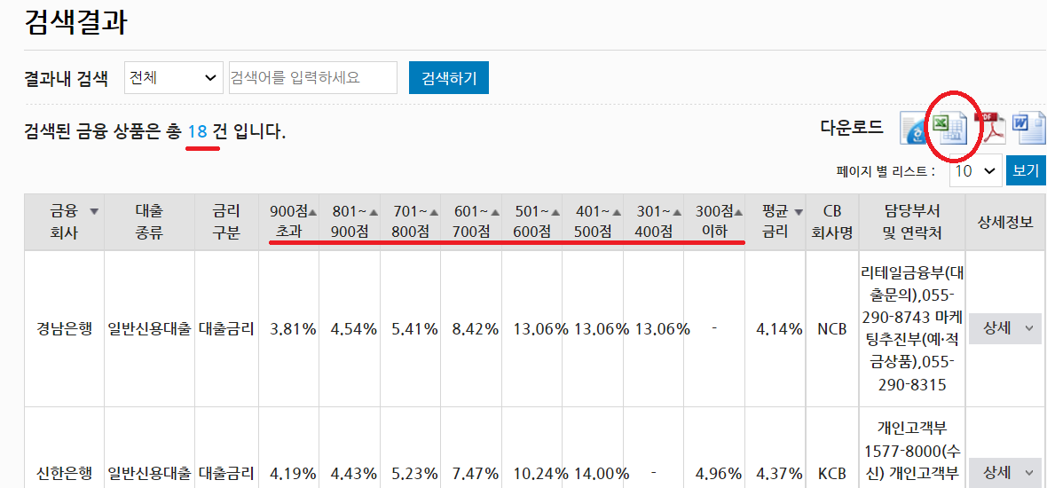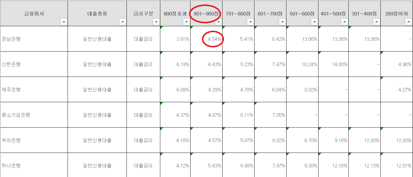 4) 아래와 같이 금융회사 상품과 신용점수에 따라 금리가 쭉 나열되는 것을 확인 하실 수 있습니다.