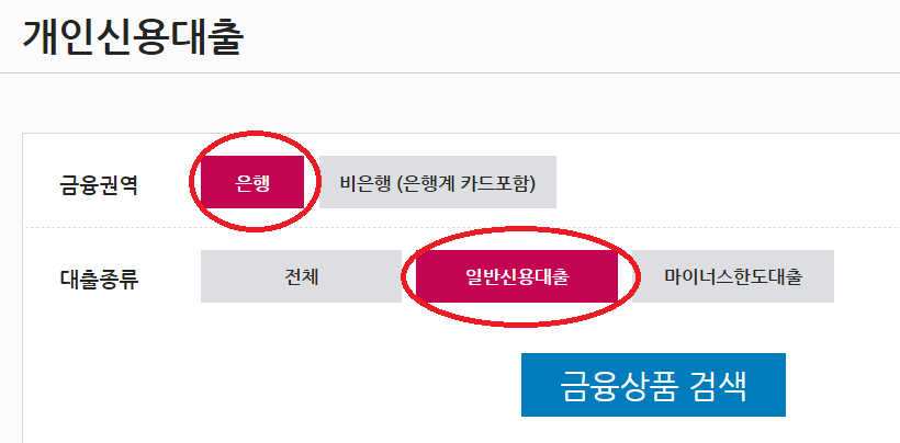 2) 아래와 같이 은행의 일반신용대출을 선택하시기 바랍니다.