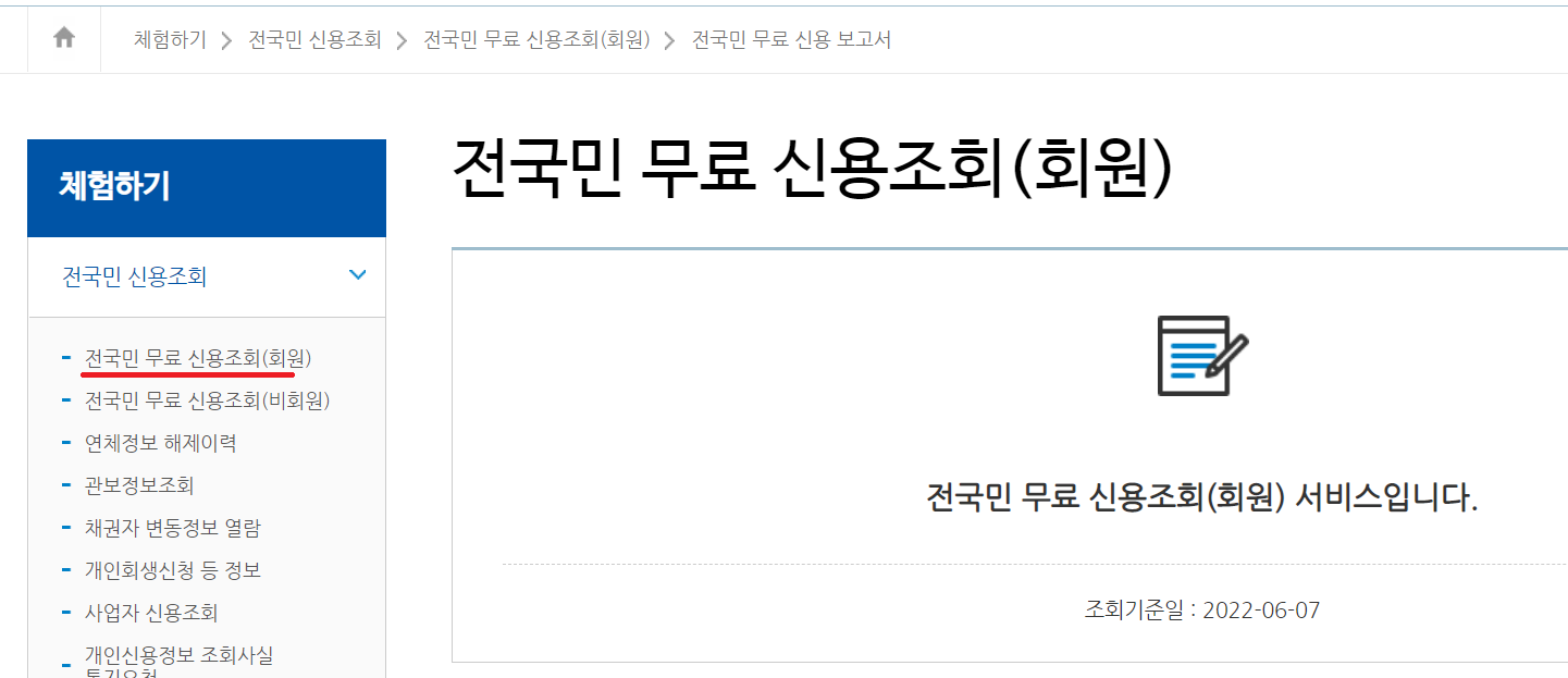 저같은 경우는 회원을 가입하여서 아래 빨강색 부분을 눌러서 신용조회를 하였습니다.