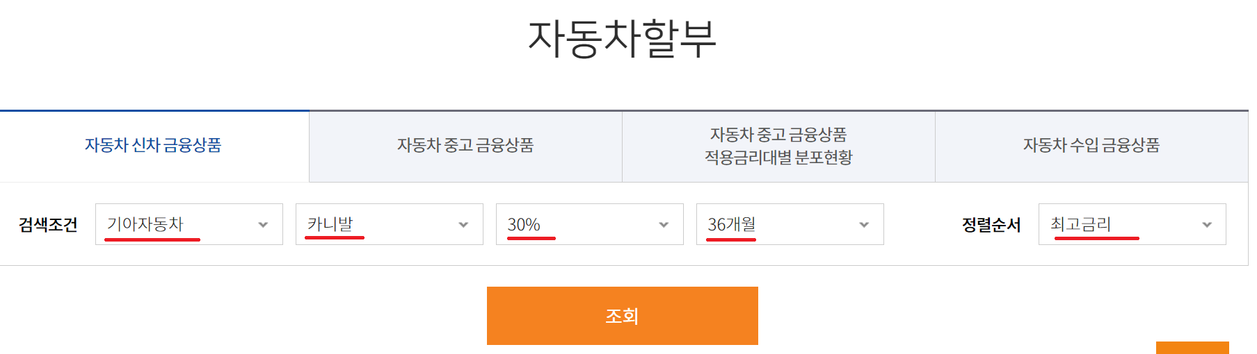 3) 아래와 같이 자동차할부금 금융상품이 정렬되어 나오는 것을 확인하실 수 있습니다.