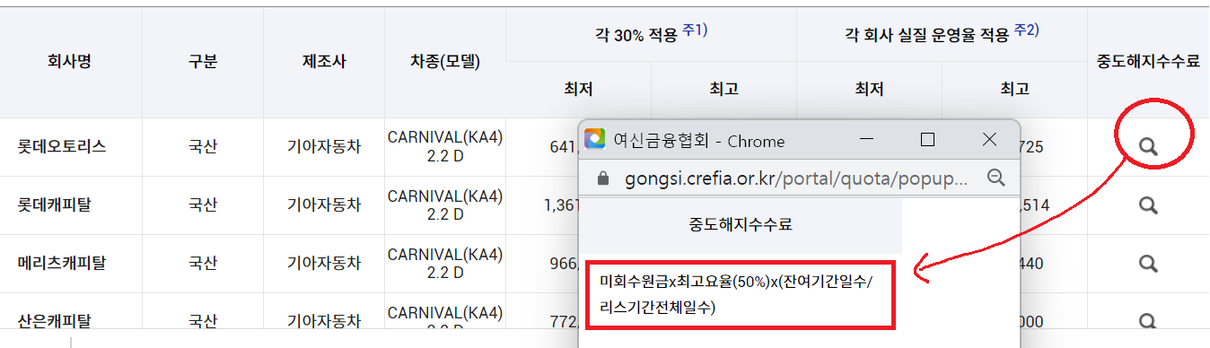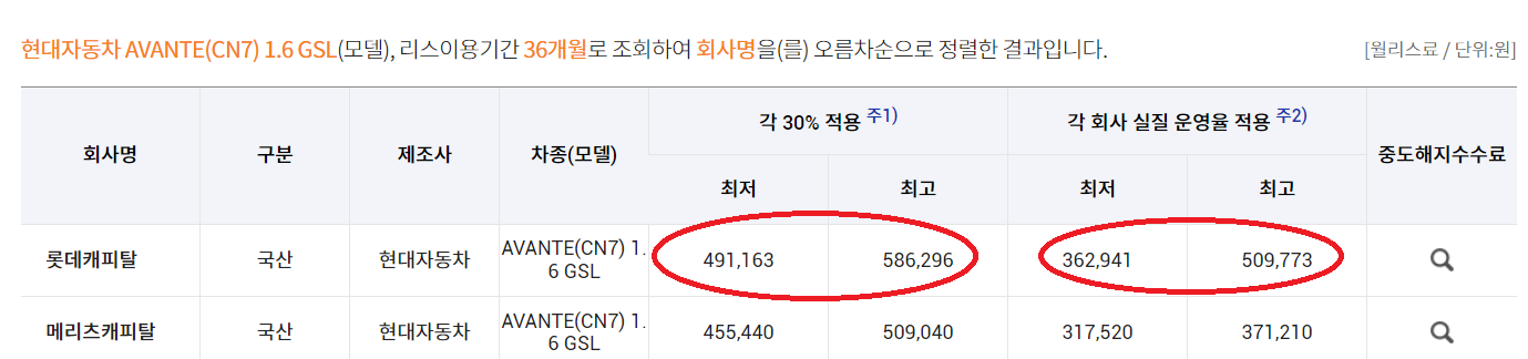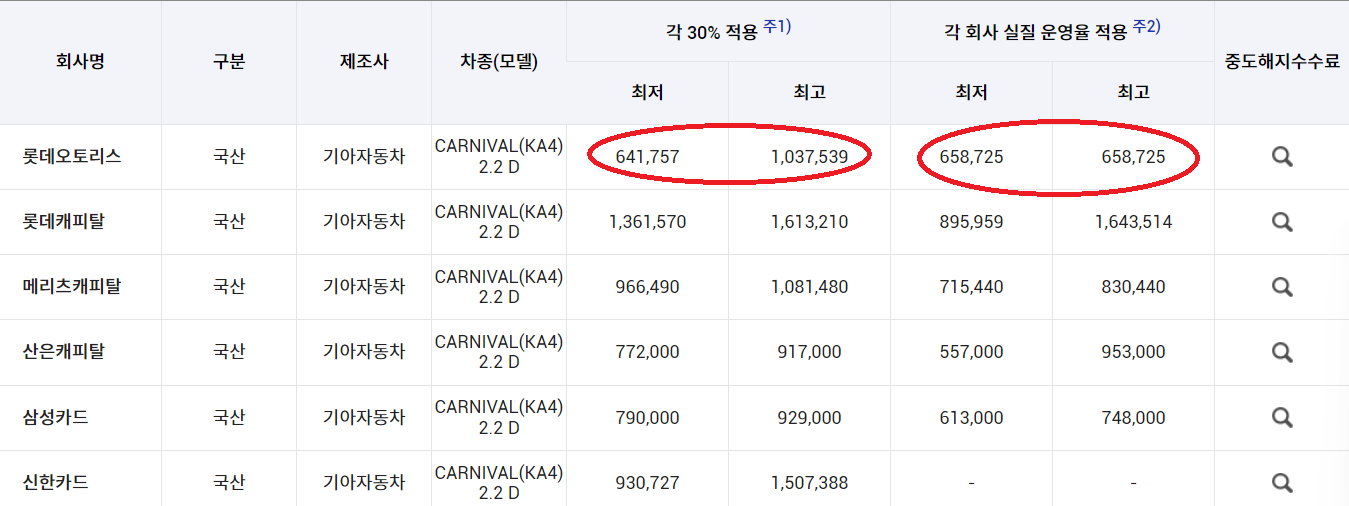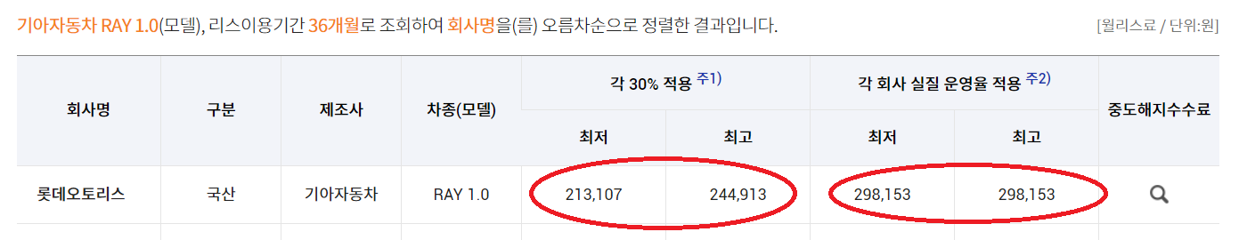 롯데오토리스의 가격이 여기서 가장 적게 나오는 것을 확인할수 있네요.