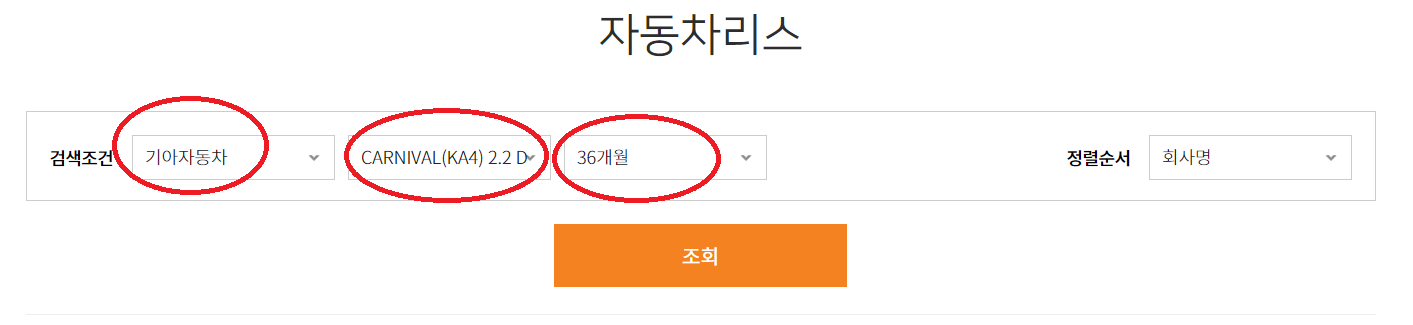 2. 그리고 아래와 같이 제조사, 차종 및 렌트 개월수를 입력하시고 조회를 눌러주세요.