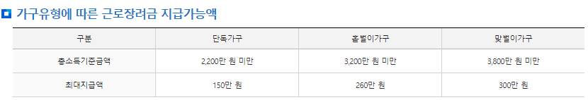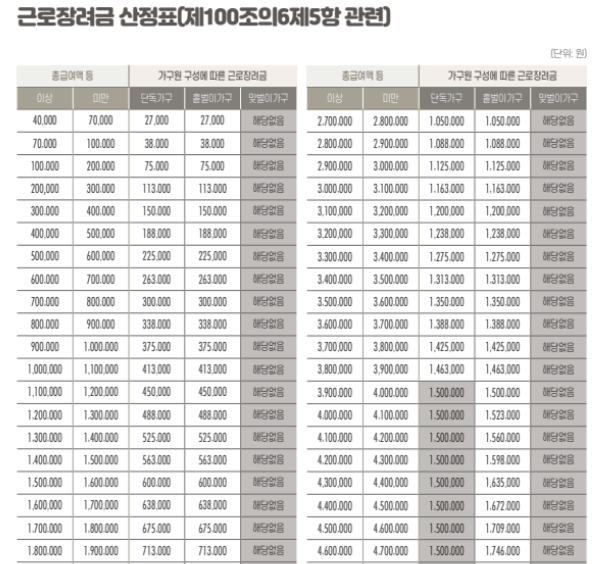아래와 같이 가족구성원 및 총급여액을 기준으로 장려금이 지급됩니다.
