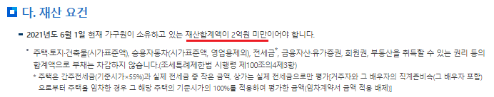재산 요건은 가구원이 소유한 재산합계가 2억 미만이어야지 신청을 할 수 있습니다.