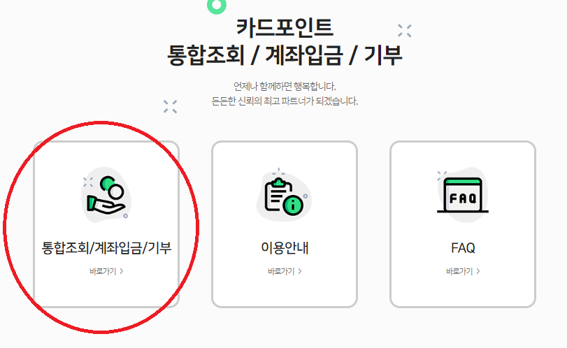카드포인트통합조회 / 계좌입금 / 기부 언제나 함께하면 행복합니다. 든든한 신뢰의 최고 파트너가 되겠습니다.