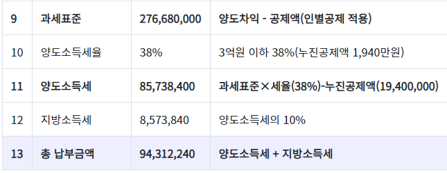 최종적으로 94,312,240원의 양도소득세를 내야 합니다.