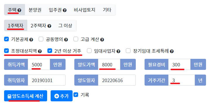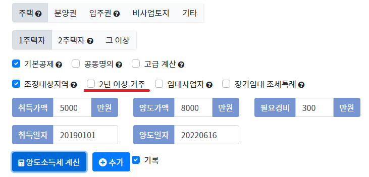 1주택자가 2년 실거주하지 않은것과 동일하게 양도세가 나오는 것을 확인 할 수있습니다.