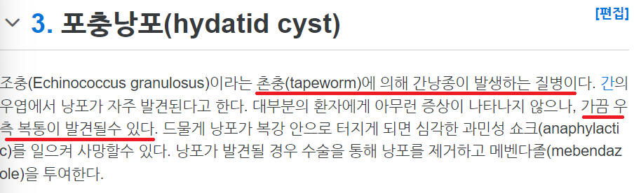 포충낭포는 촌충에 의해 간낭종이 발생하는 질병이라고 합니다.