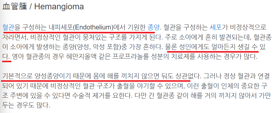 혈관종은 혈관을 구성하는 내피세포에서 나온 종양이라고 합니다.