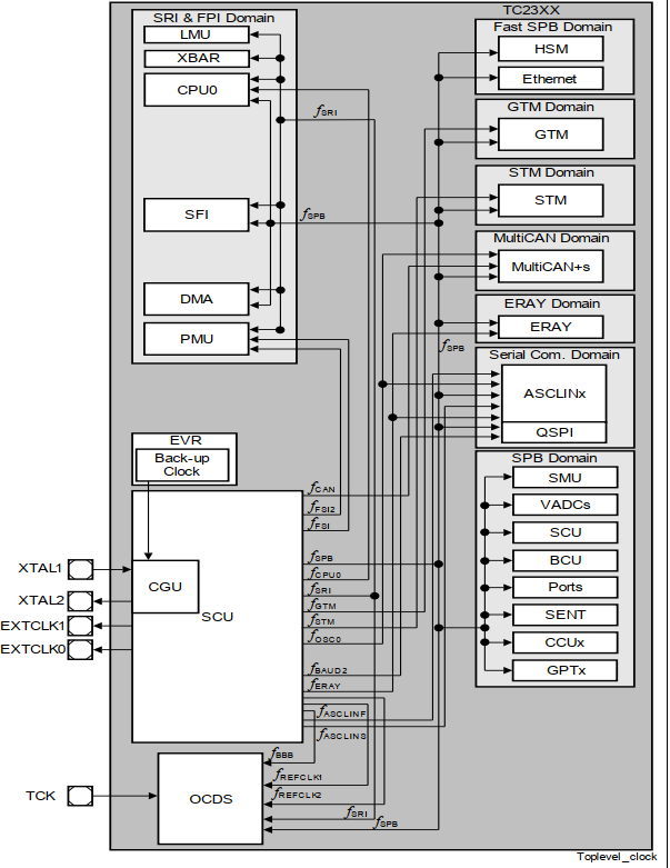 SCU_CCUCON0.B.CLKSEL = 0; /*Select the EVR as fOSC for the clock distribution */