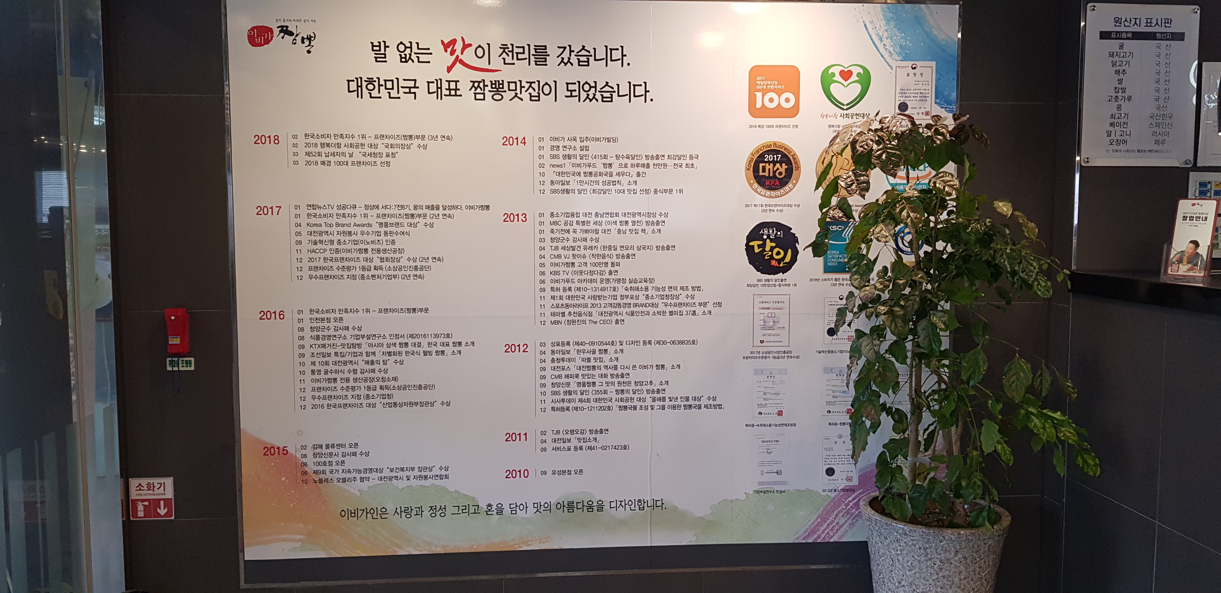 식당에 바로 들어오니 이비가짬뽕의 연혁이 적혀 있었습니다.