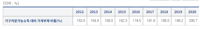 그렇다면 가구처분가능소득 대비 가계부채 비율을 살펴보면