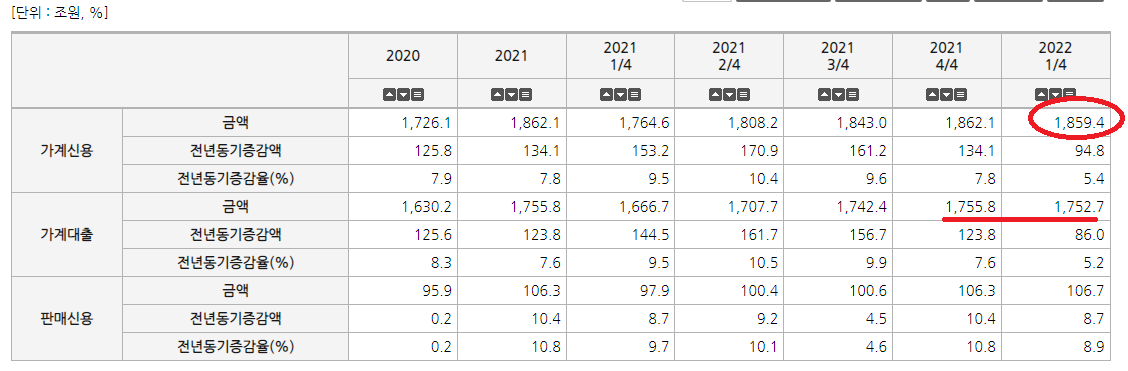 지금은 2020년에 비해서는 100조정도 가계대출이 증가했네요.