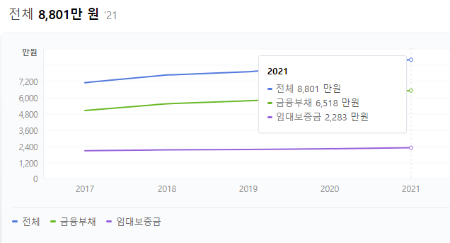 2021년 기준으로 한 가구당 8,801만원의 부채를 가지고 있다는 것을 알 수 있습니다.