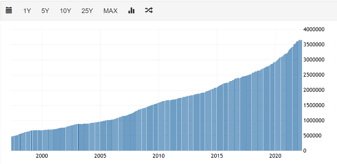 현재 시점에서 화폐발행량은 150~160조 사이입니다.그런데, 실제로 시중에 흐르는 돈은 대략 3600조 정도로 추정합니다.