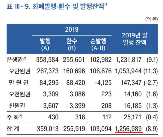 한국 화폐발행량은 2019년 기준 126조입니다.